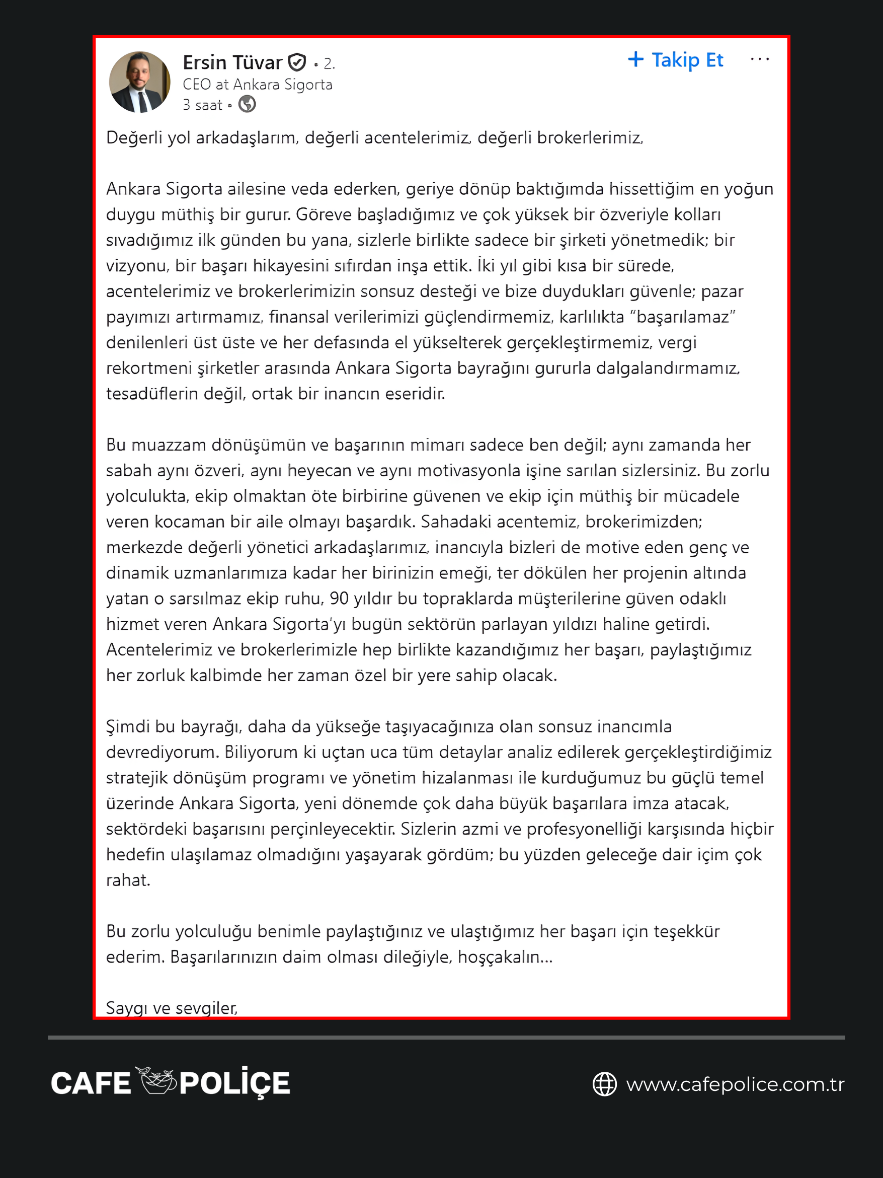 Ankara Sigorta CEO’su Ersin Tüvar, sosyal medya hesabından yaptığı açıklamayla görevinden ayrıldığını duyurdu.