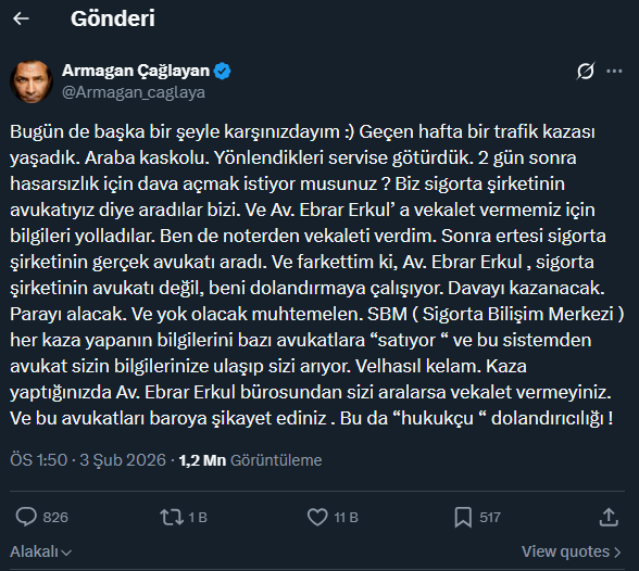 Çağlayan, geçtiğimiz hafta bir trafik kazası geçirdiğini ve aracını sigorta şirketinin yönlendirdiği servise götürdüğünü belirtti. Kazadan iki gün sonra kendisini sigorta şirketinin avukatı olarak tanıtan kişiler tarafından arandığını ifade eden Çağlayan, yönlendirilen avukata vekâlet verdiğini ancak daha sonra sigorta şirketinin gerçek avukatıyla görüşünce dolandırılmaya çalışıldığını fark ettiğini açıkladı.