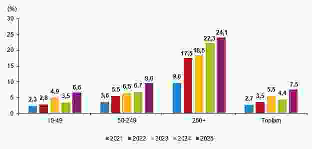 Yapay zekâ teknolojilerinden herhangi birini kullandığını beyan eden girişimlerin oranı, 2021 yılında %2,7 iken 2025 yılında %7,5’e yükseldi. Veriler, özellikle büyük ölçekli işletmelerde yapay zekâ kullanımının daha yaygın olduğunu gösterdi.