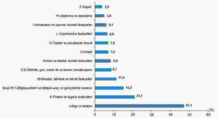 Ekonomik faaliyet gruplarına göre incelendiğinde, yapay zekâ kullanımının en yaygın olduğu sektör %47,1 ile bilgi ve iletişim faaliyetleri oldu. Bu sektörü;