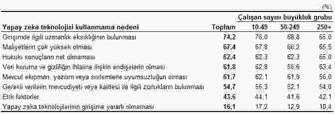 Yapay zekayı kullanmama nedenlerinin başında %74,2 ile uzman personel eksikliği geldi. Bunu;